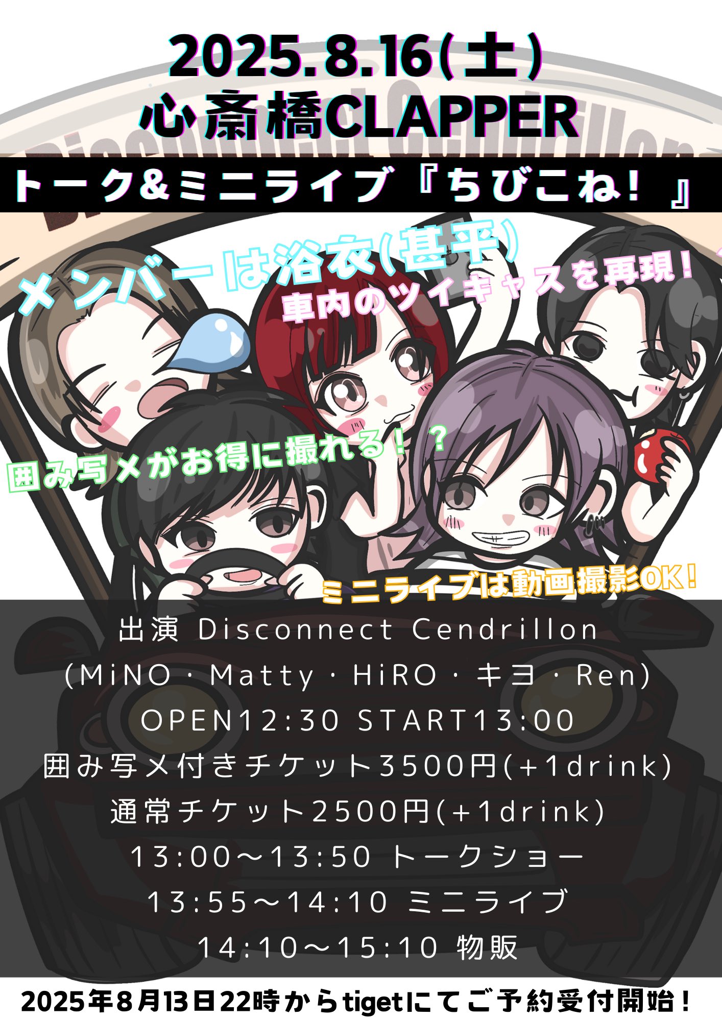 13:00〜13:50 トーク 13:55〜14:10 ミニライブ 14:10〜15:10 物販 tigetにて8月13日22時からご予約受付開始! ミニライブでは動画撮影OK! 今回はSNSへの掲載もOK! ※フロアのファンの方が映らないように配慮だけよろしくお願い致します!