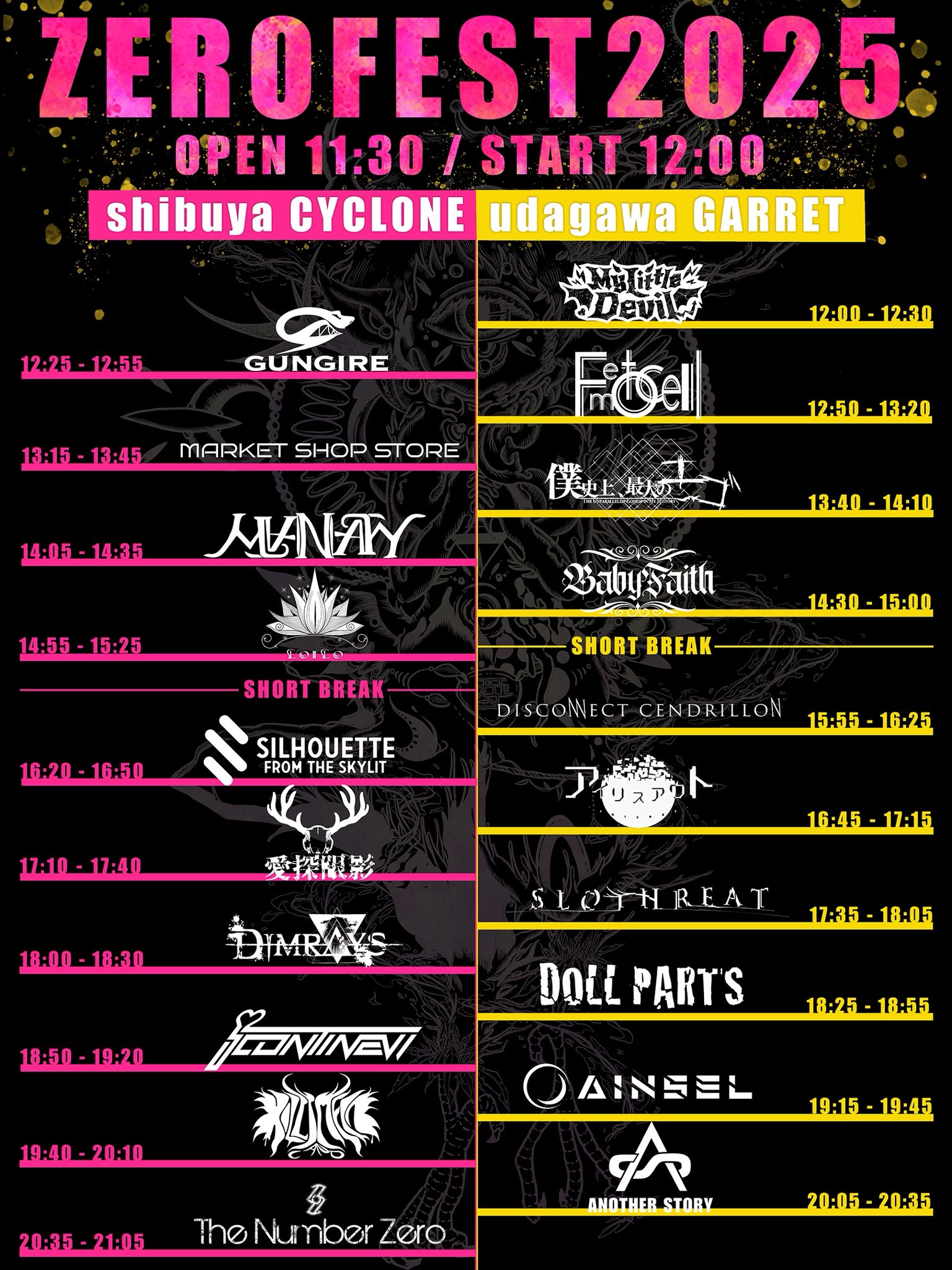 The Number Zero , AINSEL , ANOTHER STORY , Babyfaith , Dimrays , Disconnect Cendrillon , DOLL PARTS , Femtocell , GUNGIRE , icontinew , KILLT MELT LAND , LOILO , MANATY , MARKET SHOP STORE , My Little Devil , SILHOUETTE FROM THE SKYLIT , SLOTHREAT , アイリスアウト , 愛探眼影 , 僕史上最大のエゴ